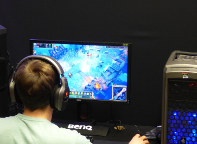 ALT: Photo of a person playing a video game on a desktop computer with headphones