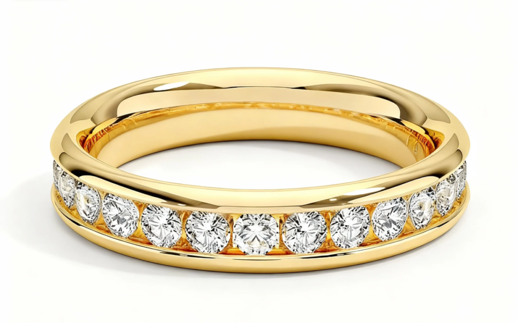Channel settings place multiple stones in a row between metal walls. The stones sit snugly against each other. This creates a continuous line of sparkle. Channel set ring types are popular for wedding bands and eternity rings. They offer good protection for the stones and are comfortable to wear. They work best with stones of identical size.